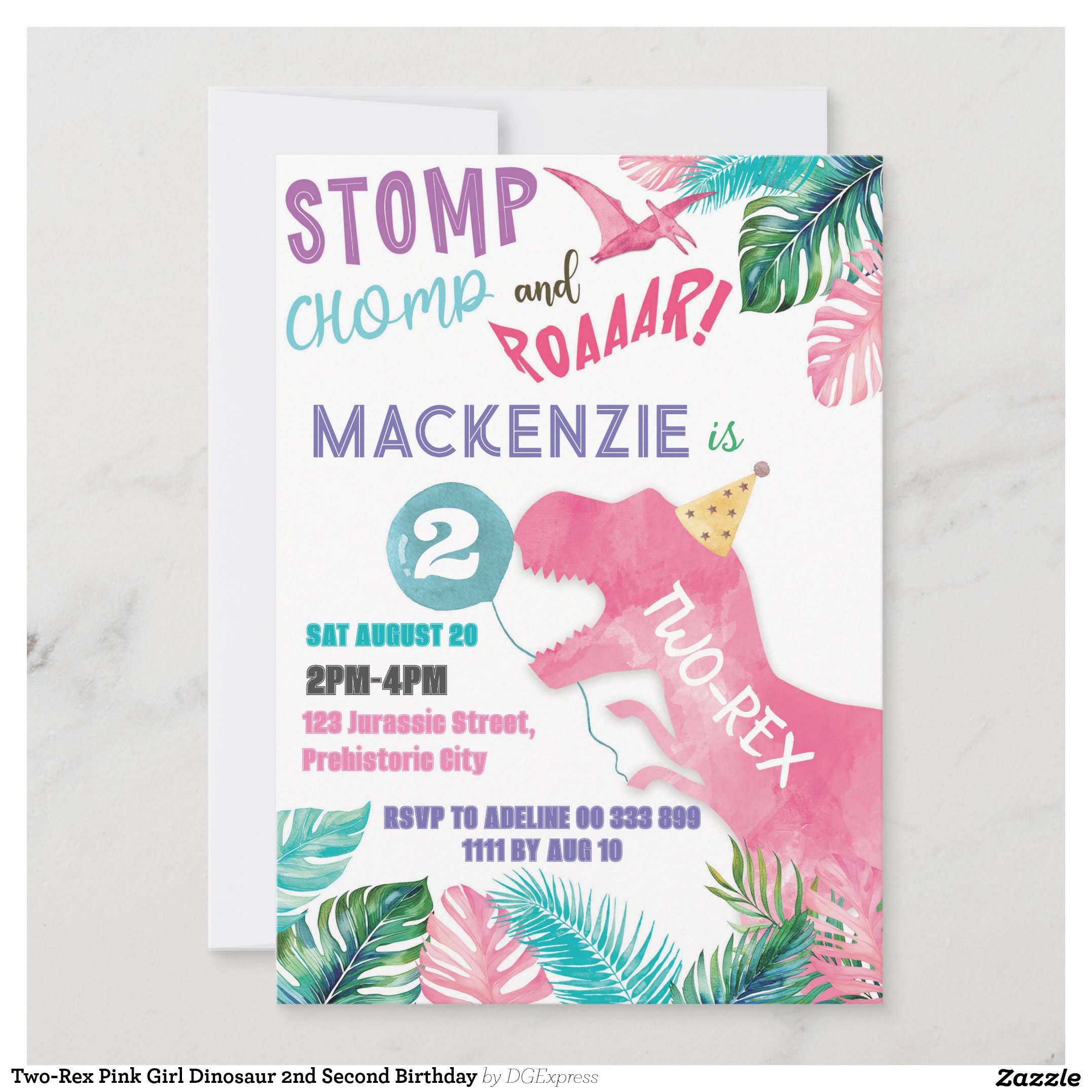 Two-Rex Pink Girl Dinosaur 2nd Second Birthday Invitation