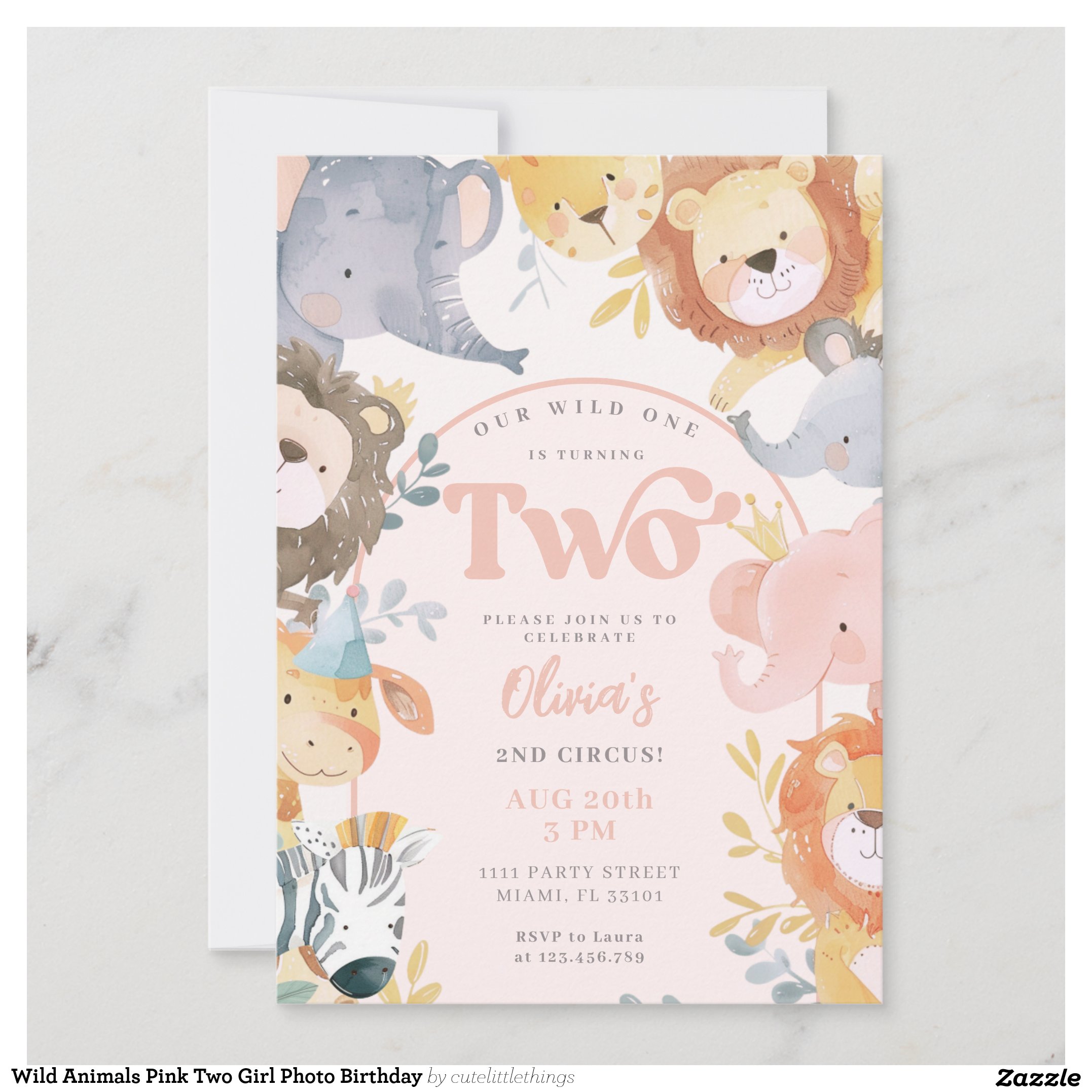 Wild Animals Pink Two Girl Photo Birthday Invitation
