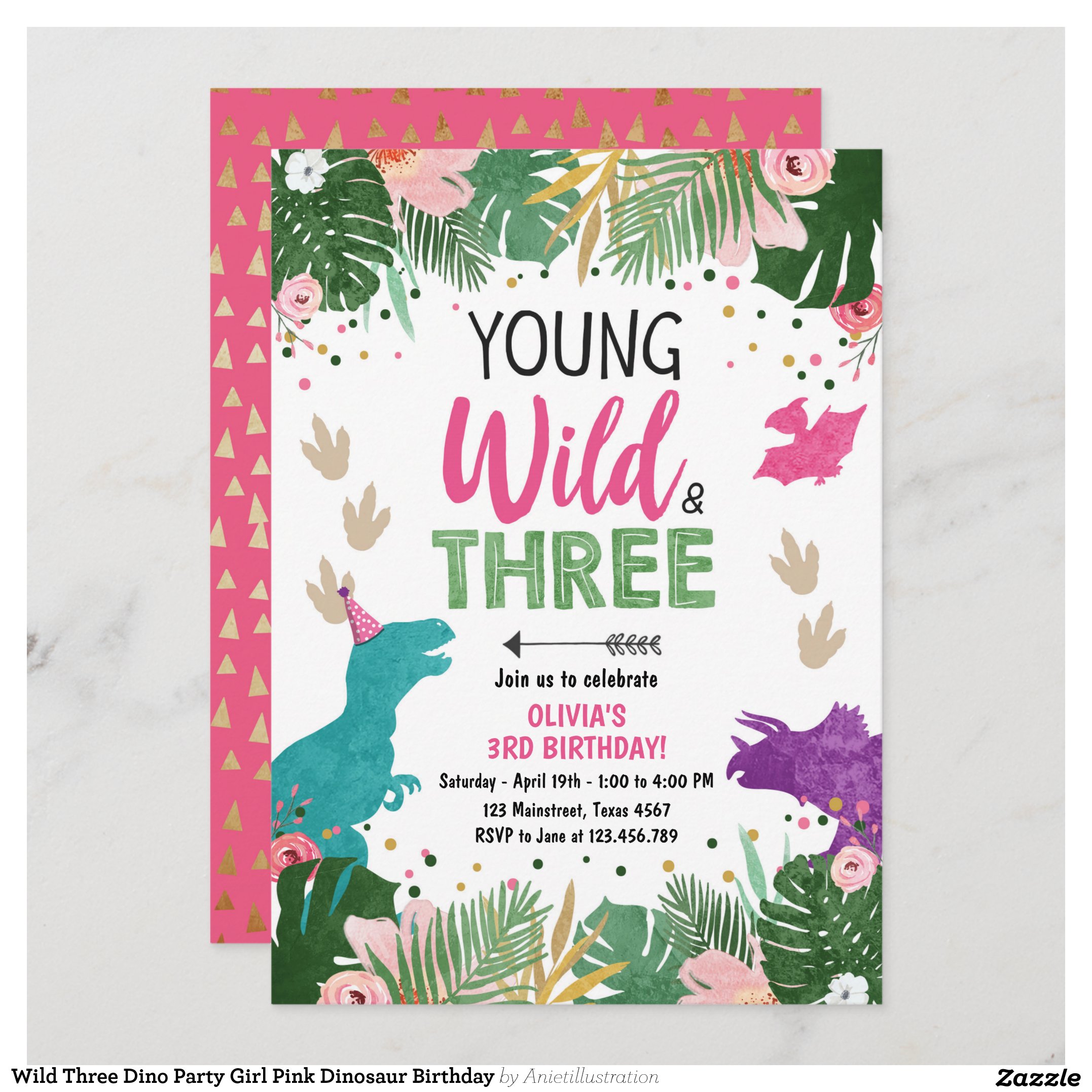 Wild Three Dino Party Girl Pink Dinosaur Birthday Invitation